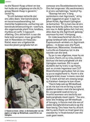 Sy pa is nou afgetree , maar hy en sy seun , Harm , en sy vrou , Jeanne , bestuur die bedrywighede uit die Upington-kantoor . Dit is veral duidelik dat hy trots is op Harm , wat as siviele ingenieur aan CUT Bloemfontein gestudeer het en nou sy pa se regterhand is . Harm is die enigste kind , maar ‘ n mens sien dat hy ‘ n sterk wil het om stewig langs sy Kalahari-boerpa te kan staan .