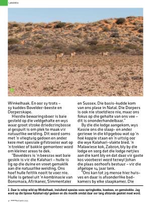 “ Bovelders is ‘ n beesras wat baie geskik is vir die Kalahari – hulle is lig op die duine en vreet gemaklik aan die natuurlike weiding . Ons hoef hulle feitlik nooit te voer nie . Hulle is geteel uit ‘ n kombinasie van Bonsmara , Afrikaner , Simmentaler