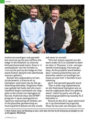 ook weer te verseël . “ Ons het mense opgelei om die werk onder ALS se vaandel te doen en later is Thusano , ‘ n nie- winsgewende maatskappy , hiervoor geskep . Al die projekte word beheer deur ‘ n bestuurskomitee wat uit plaaslike sakelui en kundiges bestaan en wat met ‘ n formele trustrekening werk wat gereeld geoudit word . “ Dan is daar nog sopkombuise en die Hoërskool Upington wie se eerste rugbyspan deur ons geborg word ,” noem hy party van die gemeenskapsprojekte op waarby ALS betrokke is .