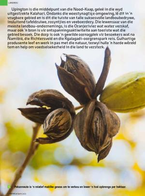 Upington is die middelpunt van die Nood-Kaap , geleë in die wyd uitgestrekte Kalahari . Ondanks die woestynagtige omgewing , lê dit in ‘ n vrugbare gebied en is dit die tuiste van talle suksesvolle landboubedrywe , insluitend tafeldruiwe , rosyntjies en veeboerdery . Die lewensaar van die meeste landbou-ondernemings , is die Oranjerivier wat water verskaf , maar ook ‘ n bron is vir ontspanningsaktiwiteite aan toeriste wat die gebied besoek . Die dorp is ook ‘ n gewilde oornagplek vir besoekers wat na Namibië , die Richtersveld en die Kgalagadi-oorgrenspark reis . Gulhartige produsente leef en werk in pas met die natuur , terwyl hulle ‘ n harde wêreld tem en help om voedselsekerheid in die land te versterk .