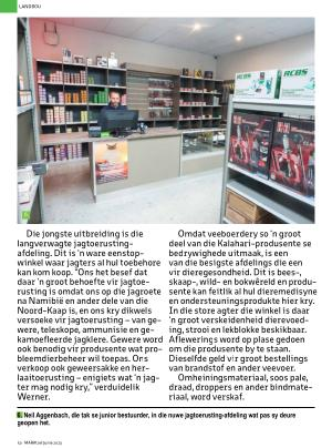 Die jongste uitbreiding is die langverwagte jagtoerustingafdeling . Dit is ‘ n ware eenstopwinkel waar jagters al hul toebehore kan kom koop . “ Ons het besef dat daar ‘ n groot behoefte vir jagtoerusting is omdat ons op die jagroete na Namibië en ander dele van die Noord-Kaap is , en ons kry dikwels versoeke vir jagtoerusting – van gewere , teleskope , ammunisie en gekamoefleerde jagklere . Gewere word ook benodig vir produsente wat probleemdierbeheer wil toepas . Ons verkoop ook geweersakke en herlaaitoerusting – enigiets wat ‘ n jagter mag nodig kry ,” verduidelik Werner .
