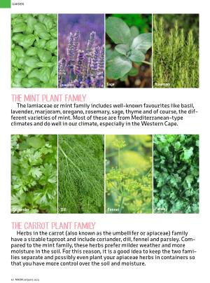 The lamiaceae or mint family includes well-known favourites like basil , lavender , marjoram , oregano , rosemary , sage , thyme and of course , the different varieties of mint . Most of these are from Mediterranean-type climates and do well in our climate , especially in the Western Cape .