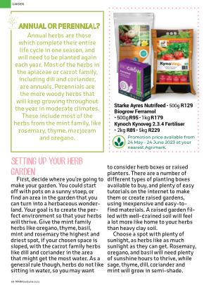 First , decide where you ’ re going to make your garden . You could start off with pots on a sunny stoep , or find an area in the garden that you can turn into a herbaceous wonderland . Your goal is to create the perfect environment so that your herbs will thrive . Give the mint family herbs like oregano , thyme , basil , mint and rosemary the highest and driest spot , if your chosen space is sloped , with the carrot family herbs like dill and coriander in the area that might get the most water . As a general rule though , herbs do not like sitting in water , so you may want