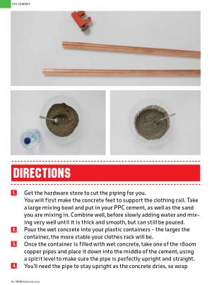 Get the hardware store to cut the piping for you . You will first make the concrete feet to support the clothing rail . Take a large mixing bowl and put in your PPC cement , as well as the sand you are mixing in . Combine well , before slowly adding water and mixing very well until it is thick and smooth , but can still be poured . Pour the wet concrete into your plastic containers - the larger the container , the more stable your clothes rack will be . Once the container is filled with wet concrete , take one of the 180cm copper pipes and place it down into the middle of the cement , using a spirit level to make sure the pipe is perfectly upright and straight . You ’ ll need the pipe to stay upright as the concrete dries , so wrap