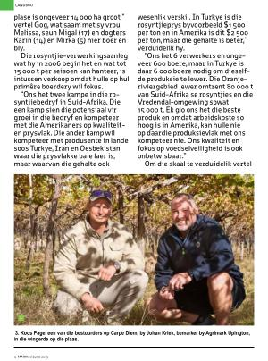 “ Ons het 6 verwerkers en ongeveer 600 boere , maar in Turkye is daar 6 000 boere nodig om dieselfde produksie te lewer . Die Oranjeriviergebied lewer omtrent 80 000 t van Suid-Afrika se rosyntjies en die Vredendal-omgewing sowat 15 000 t . Ek glo ons het die beste produk en omdat arbeidskoste so hoog is in Amerika , kan hulle nie op daardie produksievlak met ons kompeteer nie . Ons kwaliteit en fokus op voedselveiligheid is ook onbetwisbaar .”
