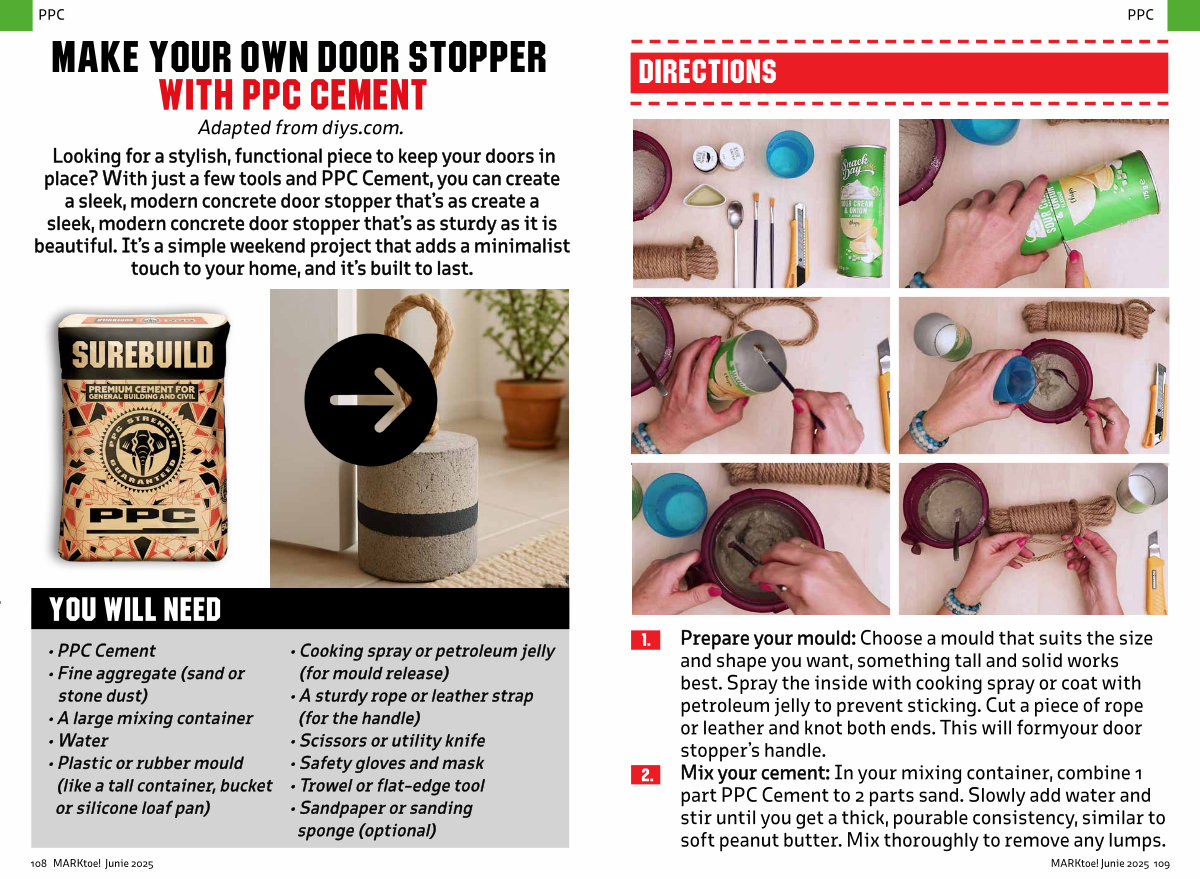 Prepare your mould: Choose a mould that suits the size and shape you want, something tall and solid works best. Spray the inside with cooking spray or coat with petroleum jelly to prevent sticking. Cut a piece of rope or leather and knot both ends. This will formyour door stopper’ s handle. Mix your cement: In your mixing container, combine 1 part PPC Cement to 2 parts sand. Slowly add water and stir until you get a thick, pourable consistency, similar to soft peanut butter. Mix thoroughly to remove any lumps.