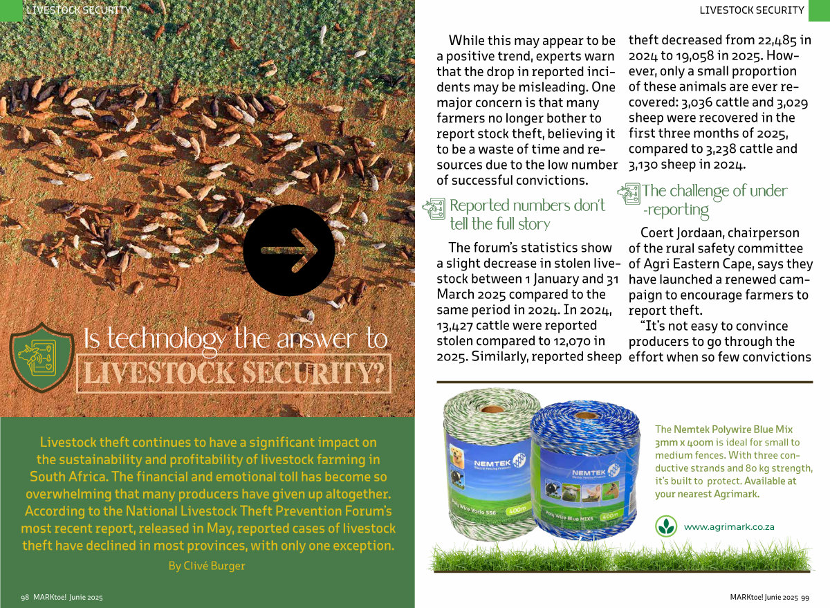Livestock theft continues to have a significant impact on the sustainability and profitability of livestock farming in South Africa. The financial and emotional toll has become so overwhelming that many producers have given up altogether. According to the National Livestock Theft Prevention Forum’ s most recent report, released in May, reported cases of livestock theft have declined in most provinces, with only one exception.