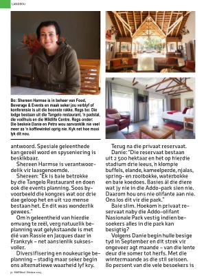 Bo : Shereen Harmse is in beheer van Food , Beverage & Events en maak seker jou verblyf of konferensie is uit die boonste rakke . Regs bo : Die lodge bestaan uit die Tangelo restaurant , ʼn padstal , die voëlhuis en die Wildlife Centre . Regs onder : Die beskeie Danie en Petro wou aanvanklik nie veel meer as ʼn koffiewinkel oprig nie . Kyk net hoe mooi lyk dit nou .