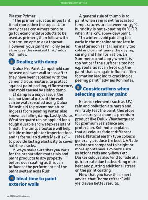 If damp is a major issue , the top horizontal parts of the wall can be waterproofed using Dulux Rainshield to prevent moisture ingress from ponding water , also known as falling damp . Lastly , Dulux Weatherguard can be applied for a tough durable and water-resistant finish . The unique texture will help to hide minor plaster imperfections and is formulated with Maxiflex™ - to provide lasting elasticity to cover hairline cracks .
