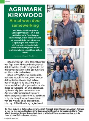 Bo : Johan Myburgh is die takbestuurder van Agrimark Kirkwood . Onder : Die span van Agrimark Kirkwood is , voor van links na regs , Nick Burkett , Piet Bosch en Johan Myburgh . In die tweede ry is Chante Pelser , Allistair Voetpad en Monique Norman . In die derde ry is Nadine Williams en Joanne Jordaan en in die vierde ry Lumari Ball en Jezanne Lottering .