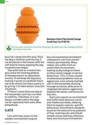 Such cats require an environment that fulfils their physical , social , and intellectual needs , allowing them to express species-specific behaviours . Enrichment should be based on the daily activity patterns of free-roaming cats and should include visual , auditory , olfactory , food , and structural stimulation .