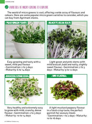The world of micro greens is vast , offering a wide array of flavours and colours . Here are some popular micro green varieties to consider , which you can buy from Agrimark stores .