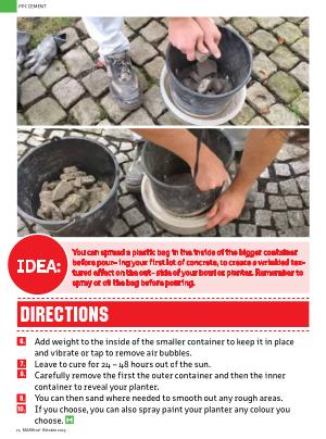 Add weight to the inside of the smaller container to keep it in place and vibrate or tap to remove air bubbles . Leave to cure for 24 – 48 hours out of the sun . Carefully remove the first the outer container and then the inner container to reveal your planter . You can then sand where needed to smooth out any rough areas . If you choose , you can also spray paint your planter any colour you choose .