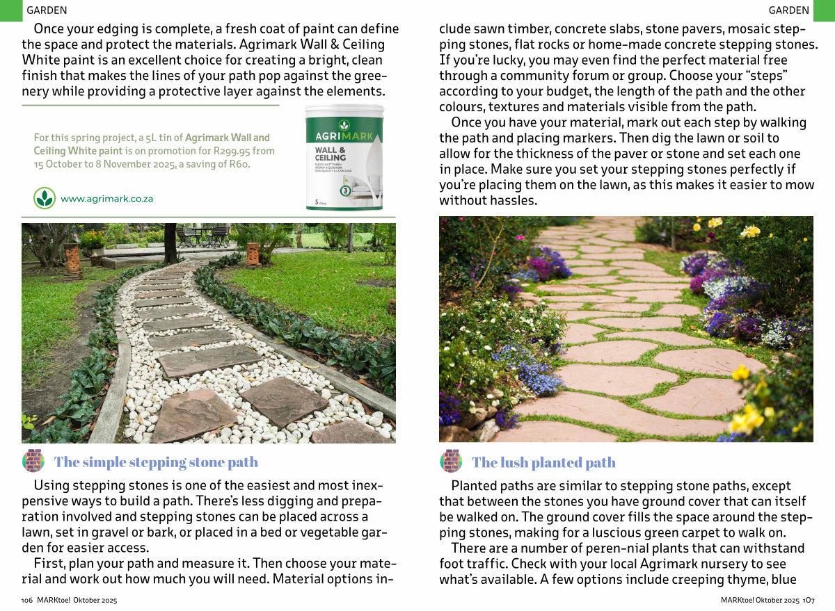 For this spring project, a 5L tin of Agrimark Wall and Ceiling White paint is on promotion for R299.95 from 15 October to 8 November 2025, a saving of R60.