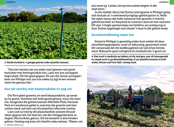 “ Ons het wortels aan my ander neef gelewer wat groot kontrakte met kettingwinkels het. Later het ons aartappels begin plant. Dit het goed gegaan. Ek was die eerste aartappelboer van Philippi wat 100 000 sakke( 15 kg) in een seisoen mark toe gestuur het.”