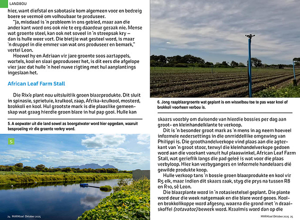 Hulle verkoop tans’ n bossie groen blaarprodukte en kool vir R5 elk, maar indien dit skaars raak, styg die prys na tussen R8 en R10, sê Leon.