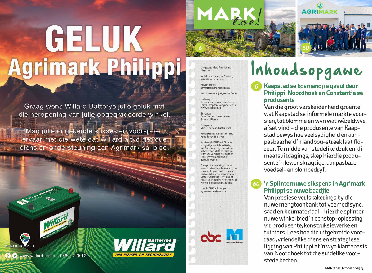 Kopiereg MARKtoe! Oktober 2025 uitgawe. Alle artikels, foto’ s en inligting hierin bevat, behoort aan Meta Publishing( Pty) Ltd., en mag nie sonder toestemming herdruk of gebruik word nie.