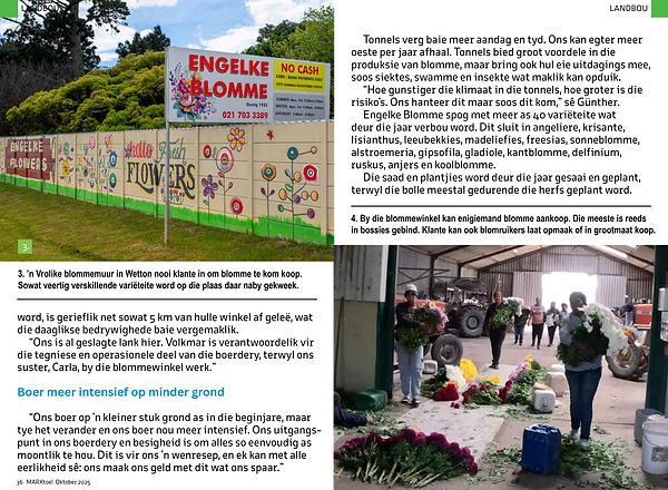 3.’ n Vrolike blommemuur in Wetton nooi klante in om blomme te kom koop. Sowat veertig verskillende variëteite word op die plaas daar naby gekweek.