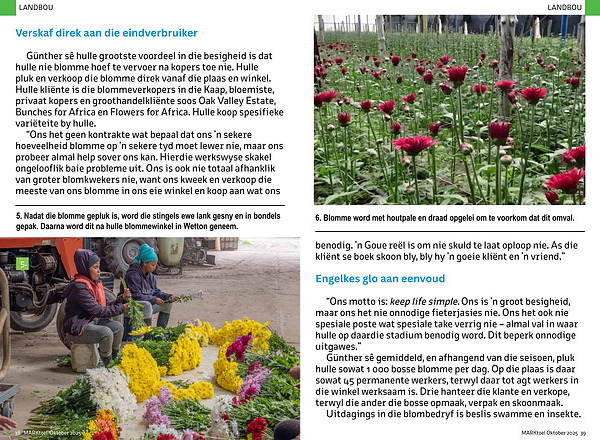 “ Ons het geen kontrakte wat bepaal dat ons’ n sekere hoeveelheid blomme op’ n sekere tyd moet lewer nie, maar ons probeer almal help sover ons kan. Hierdie werkswyse skakel ongelooflik baie probleme uit. Ons is ook nie totaal afhanklik van groter blomkwekers nie, want ons kweek en verkoop die meeste van ons blomme in ons eie winkel en koop aan wat ons
