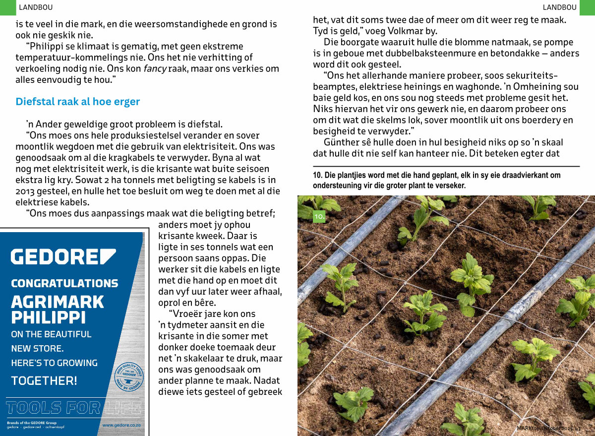 ’ n Ander geweldige groot probleem is diefstal.“ Ons moes ons hele produksiestelsel verander en sover moontlik wegdoen met die gebruik van elektrisiteit. Ons was genoodsaak om al die kragkabels te verwyder. Byna al wat nog met elektrisiteit werk, is die krisante wat buite seisoen ekstra lig kry. Sowat 2 ha tonnels met beligting se kabels is in 2013 gesteel, en hulle het toe besluit om weg te doen met al die elektriese kabels.