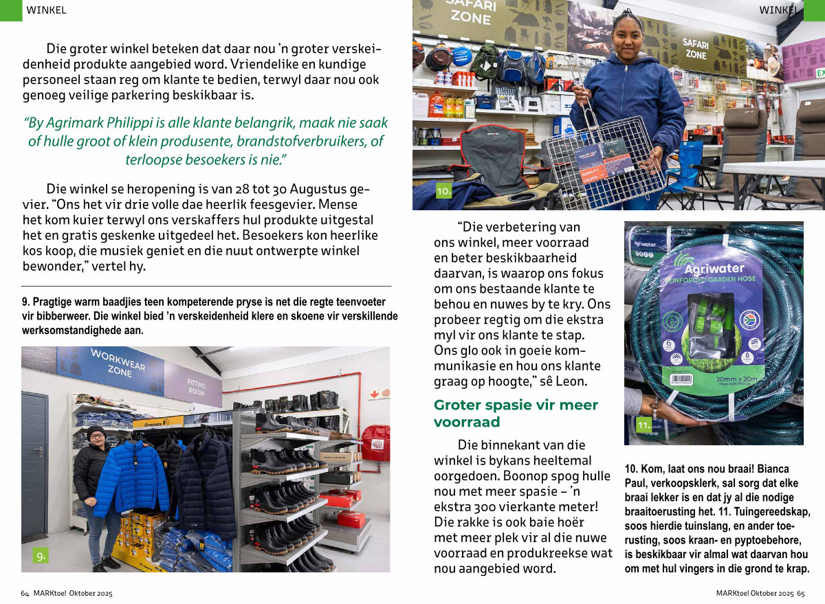 Die groter winkel beteken dat daar nou’ n groter verskeidenheid produkte aangebied word. Vriendelike en kundige personeel staan reg om klante te bedien, terwyl daar nou ook genoeg veilige parkering beskikbaar is.
