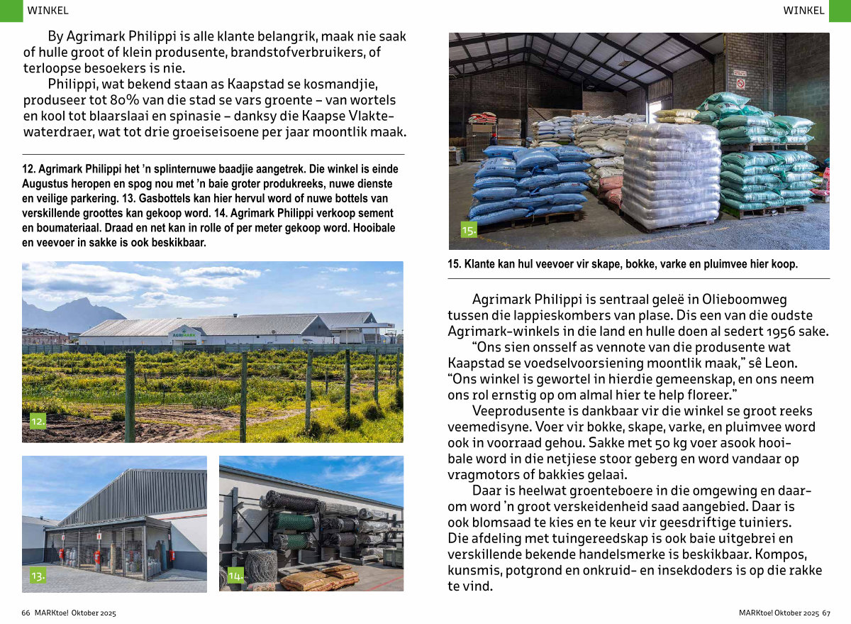 12. Agrimark Philippi het’ n splinternuwe baadjie aangetrek. Die winkel is einde Augustus heropen en spog nou met’ n baie groter produkreeks, nuwe dienste en veilige parkering. 13. Gasbottels kan hier hervul word of nuwe bottels van verskillende groottes kan gekoop word. 14. Agrimark Philippi verkoop sement en boumateriaal. Draad en net kan in rolle of per meter gekoop word. Hooibale en veevoer in sakke is ook beskikbaar.