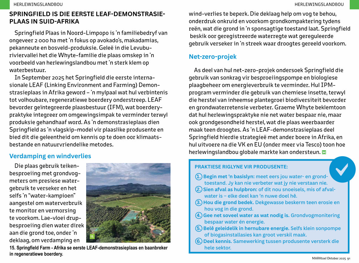 In September 2025 het Springfield die eerste internasionale LEAF( Linking Environment and Farming) Demonstrasieplaas in Afrika geword –’ n mylpaal wat hul verbintenis tot volhoubare, regeneratiewe boerdery onderstreep. LEAF bevorder geïntegreerde plaasbestuur( IFM), wat boerderypraktyke integreer om omgewingsimpak te verminder terwyl produksie gehandhaaf word. As’ n demonstrasieplaas dien Springfield as’ n vlagskip-model vir plaaslike produsente en bied dit die geleentheid om kennis op te doen oor klimaatsbestande en natuurvriendelike metodes.