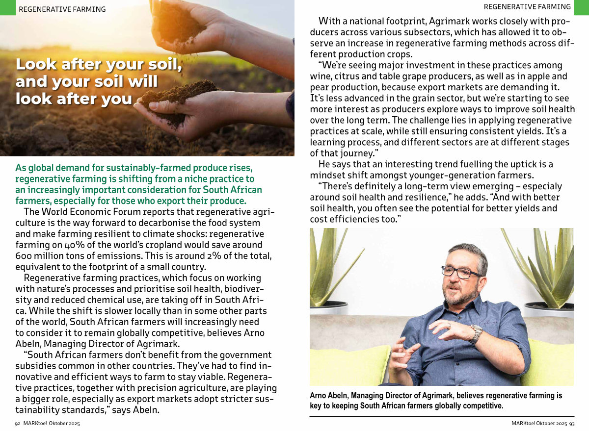 Regenerative farming practices, which focus on working with nature’ s processes and prioritise soil health, biodiversity and reduced chemical use, are taking off in South Africa. While the shift is slower locally than in some other parts of the world, South African farmers will increasingly need to consider it to remain globally competitive, believes Arno Abeln, Managing Director of Agrimark.