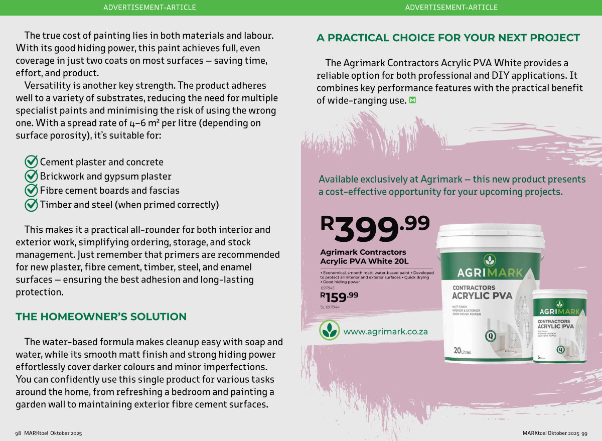 This makes it a practical all-rounder for both interior and exterior work, simplifying ordering, storage, and stock management. Just remember that primers are recommended for new plaster, fibre cement, timber, steel, and enamel surfaces— ensuring the best adhesion and long-lasting protection.