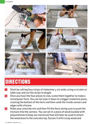 Start by cutting four strips of melamine 4 cm wide , using a circular or table saw , and cut the strips to length . Once you have the four pieces to size , screw them together to make a rectangular form . You can hot glue it down to a bigger melamine piece , creating the bottom of the form and then caulk the inside corners and edges with silicone . Make your concrete mix and then fill the form , being sure to push the mixture into the corners . You can set in a piece of wood ( coated with polyurethane to keep out moisture ) that will later be used to attach the wood base to the concrete top . Secure it with scrap wood and