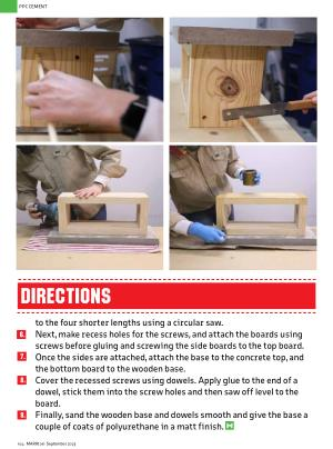 9 . to the four shorter lengths using a circular saw . Next , make recess holes for the screws , and attach the boards using screws before gluing and screwing the side boards to the top board . Once the sides are attached , attach the base to the concrete top , and the bottom board to the wooden base . Cover the recessed screws using dowels . Apply glue to the end of a dowel , stick them into the screw holes and then saw off level to the board . Finally , sand the wooden base and dowels smooth and give the base a couple of coats of polyurethane in a matt finish .