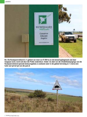 Bo : Die Nuwejaarsvleiland is ‘ n gebied van meer as 47 000 ha en die bewaringsbeginsels wat daar toegepas word , word ook deur die Pratts ondersteun . Onder : As deel van die rehabilitasiepogings van die Nuwejaarsvleiland spesiale bestuursgebied , is seekoeie weer in die gebied hervestig en ‘ n mens sien hulle van tyd tot tyd van die pad af .