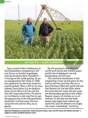 Soos soveel ander landbouers in die Bredasdorp-omgewing is AP van Zyl en sy familie al geslagte lank op die plaas Klein Sanddrift – in hul geval die vyfde geslag . Sy pa se oupagrootjie het reeds in 1898 hier geland en hy het met skape en beeste geboer . Nou is AP en sy vrou , Jodene , seun Johan ( 12 ) en dogters Jana ( 15 ) en Nina ( 17 ) hier om die Van Zyl-vlag hoog te hou . Pa Jannie en ma Helena is ook nog fiks en aan die gang en bly in die oorspronklike plaashuis ‘ n entjie weg . Die huis spog met die jaartal 1804 op sy gewel .