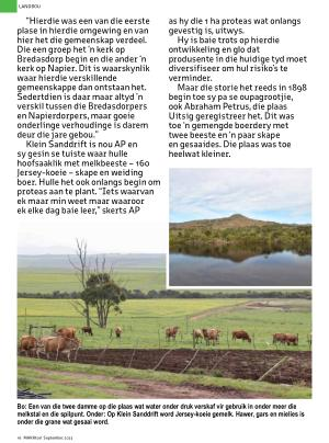 Klein Sanddrift is nou AP en sy gesin se tuiste waar hulle hoofsaaklik met melkbeeste – 160 Jersey-koeie – skape en weiding boer . Hulle het ook onlangs begin om proteas aan te plant . “ Iets waarvan ek maar min weet maar waaroor ek elke dag baie leer ,” skerts AP as hy die 1 ha proteas wat onlangs gevestig is , uitwys .