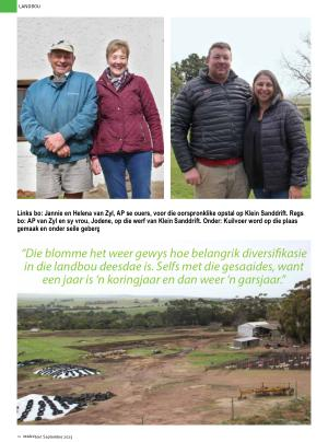 Links bo : Jannie en Helena van Zyl , AP se ouers , voor die oorspronklike opstal op Klein Sanddrift . Regs bo : AP van Zyl en sy vrou , Jodene , op die werf van Klein Sanddrift . Onder : Kuilvoer word op die plaas gemaak en onder seile geberg