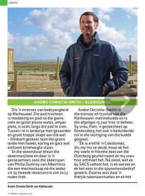 Andre Christie-Smith is die eienaar en trustee van die Kleiheuwel-merinokudde en is die afgelope 15 jaar hier in beheer . Sy vrou , Pam , ’ n geneesheer op Bredasdorp , het ook ‘ n beduidende rol in die vestiging van die kudde gespeel .