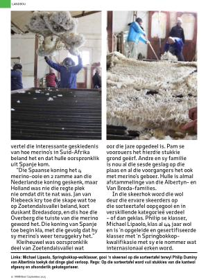 “ Die Spaanse koning het 4 merino-ooie en 2 ramme aan die Nederlandse koning geskenk , maar Holland was nie die regte plek nie omdat dit te nat was . Jan van Riebeeck kry toe die skape wat toe op Zoetendalsvallei beland , kort duskant Bredasdorp , en dis hoe die Overberg die tuiste van die merino geword het . Die koning van Spanje toe begin kla , met die gevolg dat hy sy merino ’ s weer teruggekry het .” Kleiheuwel was oorspronklik deel van Zoetendalsvallei wat oor die jare opgedeel is . Pam se voorouers het hierdie stukkie grond geërf . Andre en sy familie is nou al die sesde geslag op die plaas en al die voorgangers het ook met merino ’ s geboer . Hulle is almal afstammelinge van die Albertyn- en Van Breda-families .