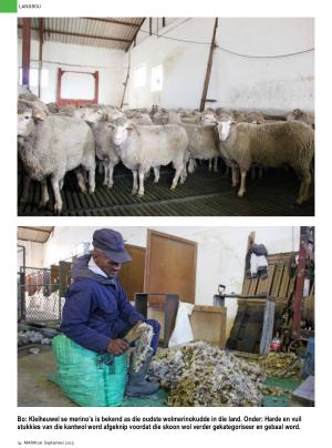 Bo : Kleiheuwel se merino ’ s is bekend as die oudste wolmerinokudde in die land . Onder : Harde en vuil stukkies van die kantwol word afgeknip voordat die skoon wol verder gekategoriseer en gebaal word .