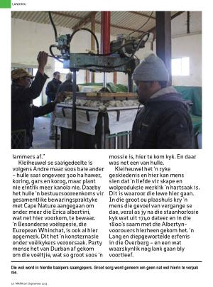 Kleiheuwel se saaigedeelte is volgens Andre maar soos baie ander – hulle saai ongeveer 300 ha hawer , koring , gars en korog , maar plant nie eintlik meer kanola nie . Daarby het hulle ‘ n bestuursooreenkoms vir gesamentlike bewaringspraktyke met Cape Nature aangegaan om onder meer die Erica albertini , wat net hier voorkom , te bewaar . ‘ n Besonderse voëlspesie , die European Whinchat , is ook al hier opgemerk . Dit het ‘ n konsternasie onder voëlkykers veroorsaak . Party mense het van Durban af gekom om die voëltjie , wat so groot soos ‘ n mossie is , hier te kom kyk . En daar was net een van hulle .