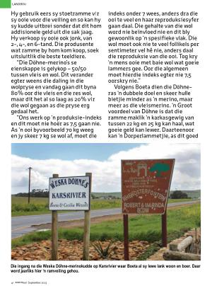 Hy gebruik eers sy stoetramme vir sy ooie voor die veiling en so kan hy sy kudde uitbrei sonder dat dit hom addisionele geld uit die sak jaag . Hy verkoop sy ooie ook jonk , van 2- , 4- , en 6-tand . Die produsente wat ramme by hom kom koop , soek uitsluitlik die beste teeldiere . “ Die Döhne-merino ’ s se eienskappe is gelykop – 50 / 50 tussen vleis en wol . Dit verander egter weens die daling in die wolpryse en vandag gaan dit byna 80 % oor die vleis en die res wol , maar dit het al so laag as 20 % vir die wol gegaan as die pryse erg gedaal het .