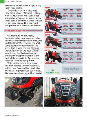 According to Hein Kruger , Technical Sales Representative for Agrimark Mechanisation Ceres , who sold the first VST Tractor , the VST Compact tractor is unique in the sense that it won the prestigious Indian Tractor of the Year ( ITOTY ) award 2023 for the best tractor under 20 horsepower and it is the first of its size within Agrimark ’ s range of farming equipment .