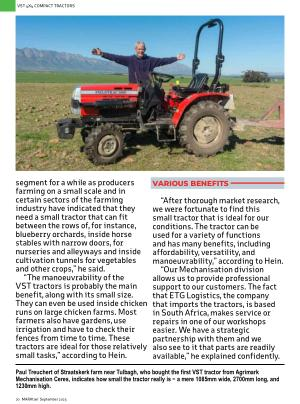 “ The manoeuvrability of the VST tractors is probably the main benefit , along with its small size . They can even be used inside chicken runs on large chicken farms . Most farmers also have gardens , use irrigation and have to check their fences from time to time . These tractors are ideal for those relatively small tasks ,” according to Hein .