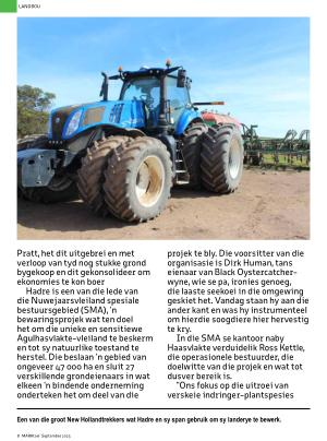 Een van die groot New Hollandtrekkers wat Hadre en sy span gebruik om sy landerye te bewerk .
