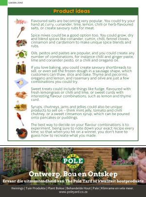 Spice mixes could be a good option too . You could grow , dry and blend spices like coriander , cumin , chilli , fennel cloves , cinnamon and cardamom to make unique spice blends and rubs .