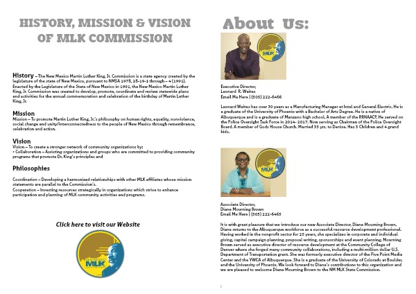It is with great pleasure that we introduce our new Associate Director, Diane Mourning Brown. Diane returns to the Albuquerque workforce as a successful resource development professional. Having worked in the nonprofit sector for 25 years, she specializes in corporate and individual giving, capital campaign planning, proposal writing, sponsorships and event planning. Mourning Brown served as executive director of resource development at the Community College of Denver where she forged many community collaborations, including a multi-million dollar U.S. Department of Transportation grant. She was formerly executive director of the Five Point Media Center and the YWCA of Albuquerque. She is a graduate of the University of Colorado at Boulder, and the University of Phoenix. We look forward to Diane’s contributions to this organization and we are pleased to welcome Diane Mourning Brown to the NM MLK State Commission.