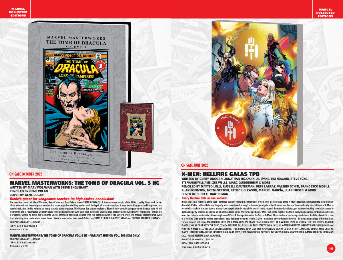The creative talents of Marv Wolfman, Gene Colan and Tom Palmer made TOMB OF DRACULA the must-read comic of the 1970s. Lushly illustrated, beautifully colored and featuring taut stories that wove together thrilling action with in-depth character subplots, it was everything you could hope for in a comic book. And in this volume, so many strands come together: The Doctor Sun saga concludes, Blade finally wreaks vengeance on the man who killed his mother and a resurrected Count Dracula finds an unholy bride who will bear his child! Dracula also crosses paths with Marvel mainstays – including a crossover where he sinks his teeth into Doctor Strange’ s neck and a battle with the cosmic power of the Silver Surfer! The Marvel Masterworks, with their stunning new restoration, make these classics look better than ever! Collecting TOMB OF DRACULA( 1972) # 41-55 and DOCTOR STRANGE( 1974) # 14. 328 PGS./ Rated T …$ 75.00 ISBN: 978-1-302-96255-5 Trim size: 7 x 10