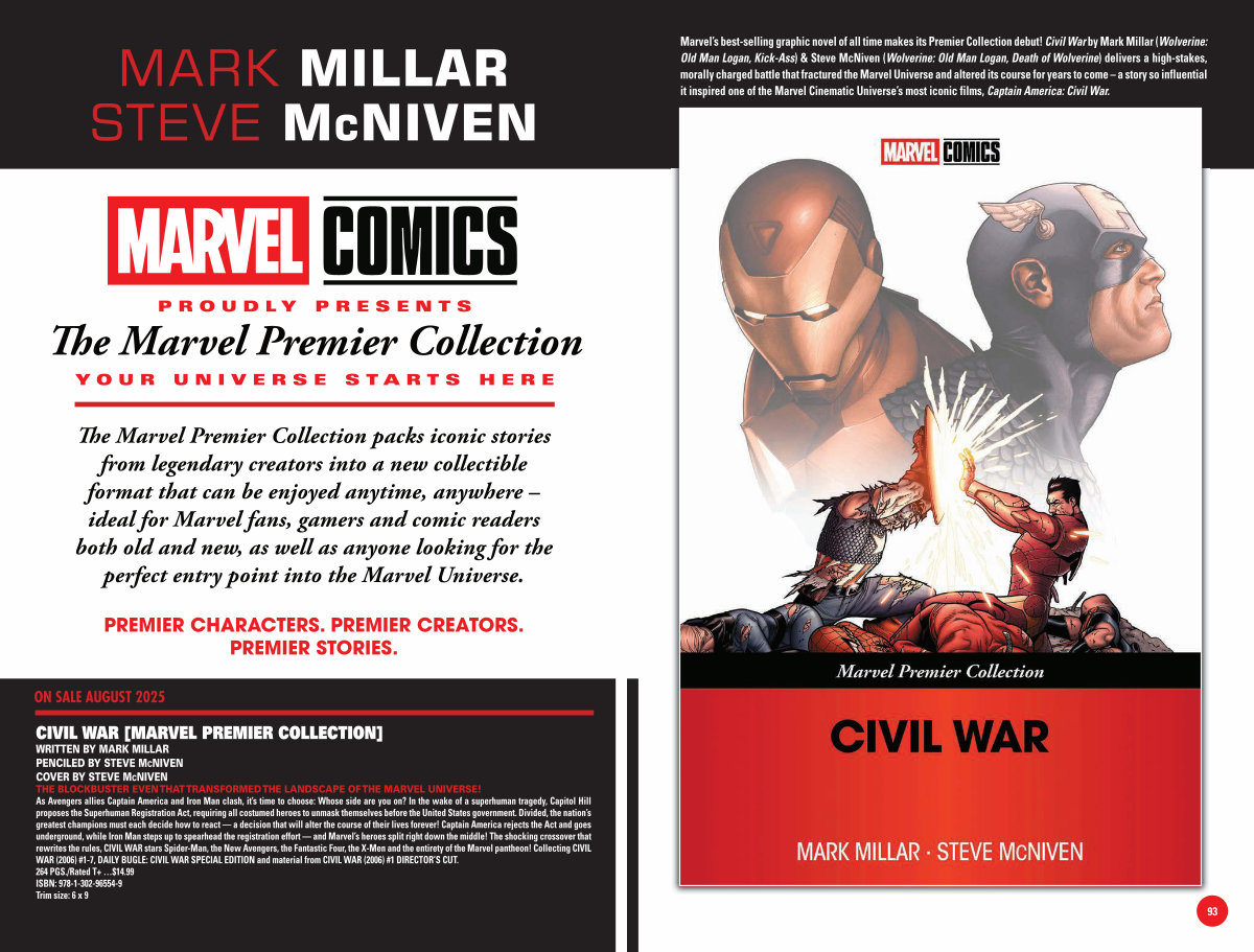 Marvel’ s best-selling graphic novel of all time makes its Premier Collection debut! Civil War by Mark Millar( Wolverine: Old Man Logan, Kick-Ass) & Steve McNiven( Wolverine: Old Man Logan, Death of Wolverine) delivers a high-stakes, morally charged battle that fractured the Marvel Universe and altered its course for years to come – a story so influential it inspired one of the Marvel Cinematic Universe’ s most iconic films, Captain America: Civil War.
