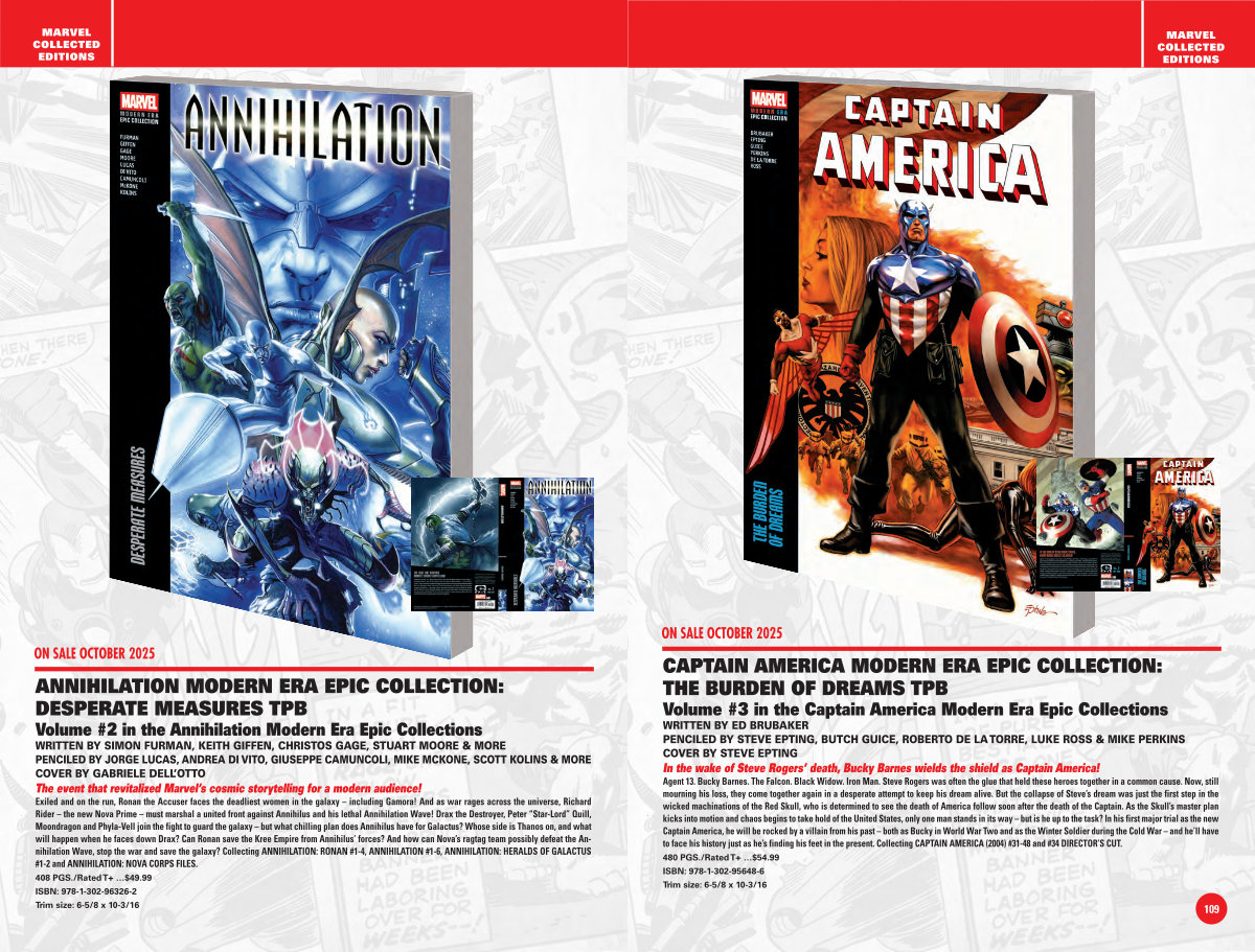 Agent 13. Bucky Barnes. The Falcon. Black Widow. Iron Man. Steve Rogers was often the glue that held these heroes together in a common cause. Now, still mourning his loss, they come together again in a desperate attempt to keep his dream alive. But the collapse of Steve’ s dream was just the first step in the wicked machinations of the Red Skull, who is determined to see the death of America follow soon after the death of the Captain. As the Skull’ s master plan kicks into motion and chaos begins to take hold of the United States, only one man stands in its way – but is he up to the task? In his first major trial as the new Captain America, he will be rocked by a villain from his past – both as Bucky in World War Two and as the Winter Soldier during the Cold War – and he’ ll have to face his history just as he’ s finding his feet in the present. Collecting CAPTAIN AMERICA( 2004) # 31-48 and # 34 DIRECTOR’ S CUT.