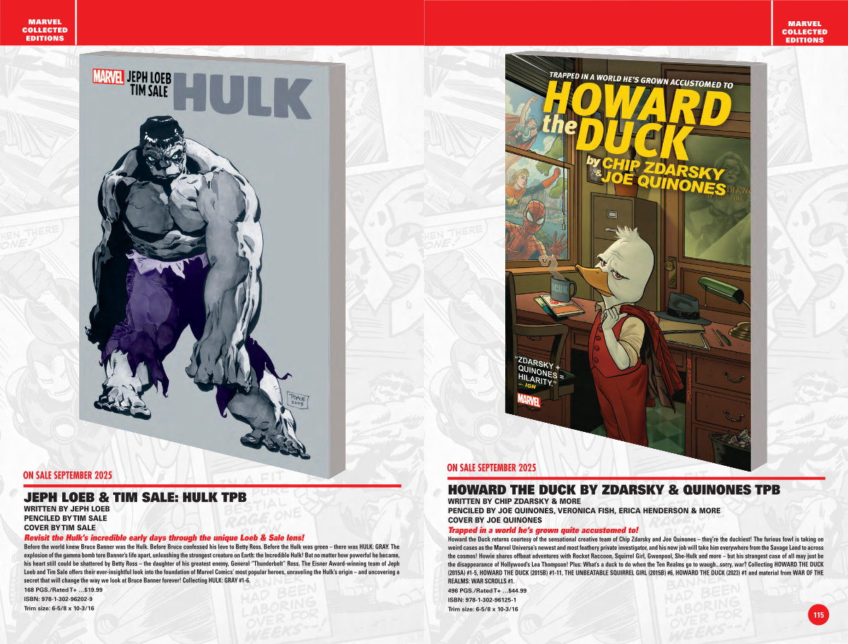 Howard the Duck returns courtesy of the sensational creative team of Chip Zdarsky and Joe Quinones – they’ re the duckiest! The furious fowl is taking on weird cases as the Marvel Universe’ s newest and most feathery private investigator, and his new job will take him everywhere from the Savage Land to across the cosmos! Howie shares offbeat adventures with Rocket Raccoon, Squirrel Girl, Gwenpool, She-Hulk and more – but his strangest case of all may just be the disappearance of Hollywood’ s Lea Thompson! Plus: What’ s a duck to do when the Ten Realms go to waugh... sorry, war? Collecting HOWARD THE DUCK( 2015A) # 1-5, HOWARD THE DUCK( 2015B) # 1-11, THE UNBEATABLE SQUIRREL GIRL( 2015B) # 6, HOWARD THE DUCK( 2023) # 1 and material from WAR OF THE REALMS: WAR SCROLLS # 1. 496 PGS./ Rated T + …$ 44.99 ISBN: 978-1-302-96125-1 Trim size: 6-5 / 8 x 10-3 / 16