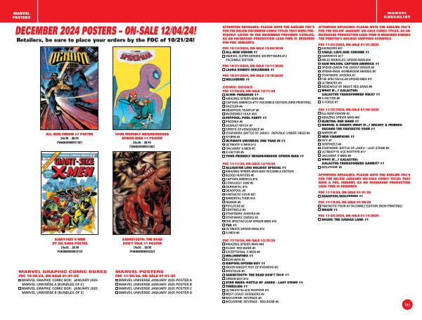 FOC 11 / 18 / 24 , ON-SALE 12 / 25 / 24 AMAZING SPIDER-MAN # 64 BLADE : RED BAND # 3 EXCEPTIONAL X-MEN # 4 HELLHUNTERS # 1 IRON MAN # 3 KIDPOOL / SPIDER-BOY # 1 MOON KNIGHT : FIST OF KHONSHU # 3 MYSTIQUE # 3 SABRETOOTH : THE DEAD DON ' T TALK # 1 SPIDER-BOY # 14 STAR WARS : BATTLE OF JAKKU - LAST STAND # 1 TIMESLIDE # 1 ULTIMATE BLACK PANTHER # 11 WEST COAST AVENGERS # 2 WOLVERINE : REVENGE # 5 WOLVERINE : REVENGE - RED BAND # 5